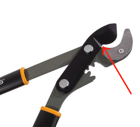What the ads don’t say is that you’ll need to buy a new replacement blade every two weeks because the original blade will invariably break at the location indicated by the red arrow. The price of the replacement blade is hefty: For the price of two replacemant blades Fiskars will sell you the brand new loppers.